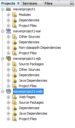 <?xml version="1.0" encoding="UTF-8"?> <project xmlns="http://maven.apache.org/POM/4.0.0" xmlns:xsi="http://www.w3.org/2001/XMLSchema-instance" xsi:schemaLocation="http://maven.apache.org/POM/4.0.0 http://maven.apache.org/xsd/maven-4.0.0.xsd"> <modelVersion>4.0.0</modelVersion> <parent> <artifactId>mavenproject1</artifactId> <groupId>es.jesramgue.earproject</groupId> <version>1.0-SNAPSHOT</version> </parent> <groupId>es.jesramgue.earproject</groupId> <artifactId>mavenproject1-ear</artifactId> <version>1.0-SNAPSHOT</version> <packaging>ear</packaging> <name>mavenproject1-ear</name> <properties> <project.build.sourceEncoding>UTF-8</project.build.sourceEncoding> </properties> <build> <plugins> <plugin> <groupId>org.apache.maven.plugins</groupId> <artifactId>maven-compiler-plugin</artifactId> <version>3.1</version> <configuration> <source>1.7</source> <target>1.7</target> </configuration> </plugin> <plugin> <groupId>org.apache.maven.plugins</groupId> <artifactId>maven-ear-plugin</artifactId> <version>2.8</version> <configuration> <version>6</version> <defaultLibBundleDir>lib</defaultLibBundleDir> </configuration> </plugin> </plugins> </build> <dependencies> <dependency> <groupId>es.jesramgue.earproject</groupId> <artifactId>mavenproject1-ejb</artifactId> <version>1.0-SNAPSHOT</version> <type>ejb</type> </dependency> <dependency> <groupId>es.jesramgue.earproject</groupId> <artifactId>mavenproject1-web</artifactId> <version>1.0-SNAPSHOT</version> <type>war</type> </dependency> </dependencies> </project>